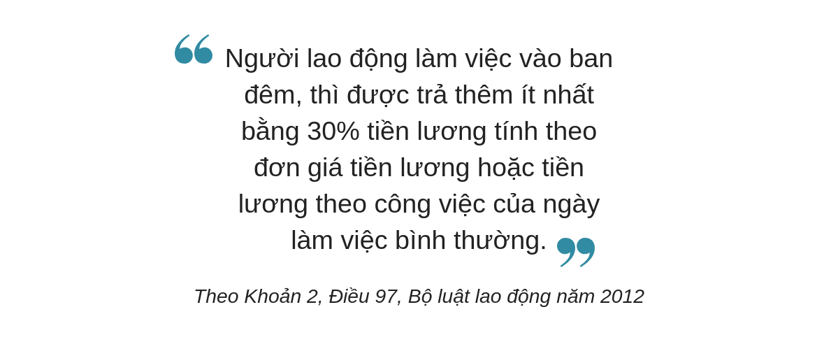 Theo quy định của Bộ luật lao động năm 2012, nếu bạn làm việc vào ban đêm thì mức lương được hưởng sẽ cao hơn ít nhất 30% so với mức lương của ngày làm việc bình thường.